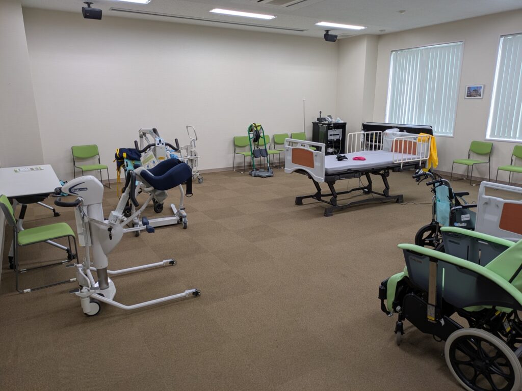 青森県老健協会津軽支部研修(弘前医療福祉大)・あおもりノーリフティングケア推進事業八戸地区研修(友の会福祉会館)・津軽地区研修(弘前総合学習センタ)にて開催!当メンバーも講師として技術指導担当として参加致しました!八戸地区研修にはテイクオフ(スタンディングリフト)持参しお伺いしました、床走行リフトが不調という事で、急遽テイクオフの実技指導を実施、2枚目の画像については青森県老健協会津軽支部研修という事で数式会社いうら様のご協力によりミニ福祉機器展ばりの福祉機器をご用意いただきました、地区研修津軽はいつもの市民会館から会場を変え、弘前総合学習センターにて実施、参加者は少ないながらも推進リーダーさん達の熱い指導のおかげでとても楽しい研修会となりました、津軽地区では今期残すところ2つの研修を予定しています、頑張っていきましょう!